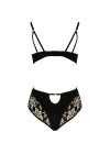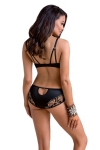 Le haut du body est composé d'un soutien-gorge balconnets à armatures en résille bicolore noir et or, qui éclaire le corps de tissus noir et met joliment en valeur la poitrine.