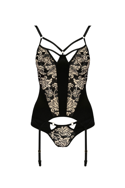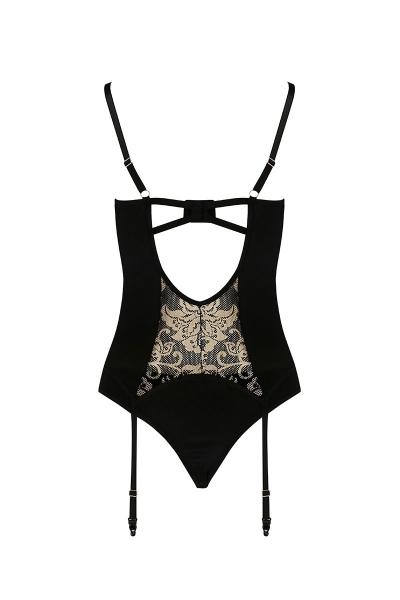 Composition de résille noire et or aux riches motifs baroques et de tissus noir satiné, cet ensemble de charme guêpière et culotte est la lingerie que vous aimerez porter sous votre robe préférée.