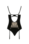 Joliment coupée et structurée par ses panneaux de riche résille, cette guêpière possède des bonnets à balconnets ouverts sur la rondeur des seins, et couronnés par une lanière fantaisie fixée à des anneaux dorés. Garantie d'un bon maintien de la poitrine, le soutien-gorge est fermé dans le dos par une attache à agrafes.