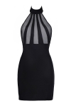 La poitrine de cette mini robe noire est fabriquée de pièces de tissu qui alternent entre de la microfibre et du tulle transparent. Cet empiècement vertical mettra vos seins particulièrement en valeur.